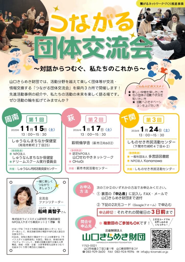 山口きらめき財団では、活動分野を越えて楽しく団体同士で交流・情報交換する「つながる団体交流会」を県内3カ所で開催します。